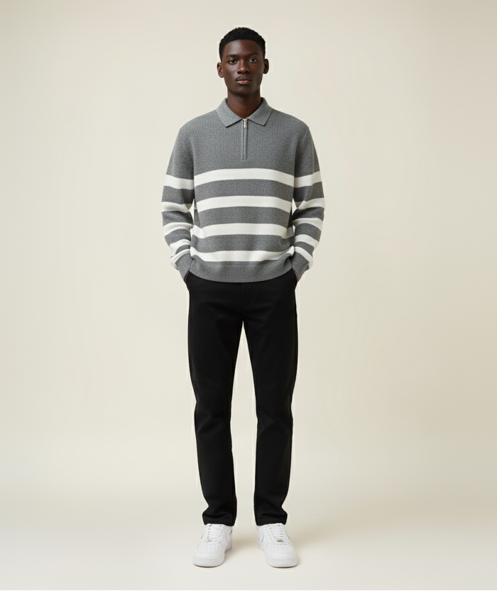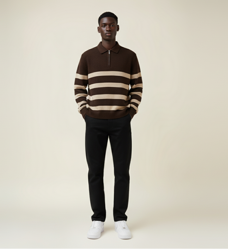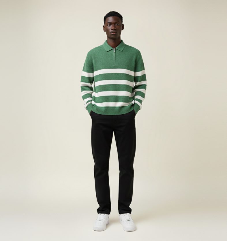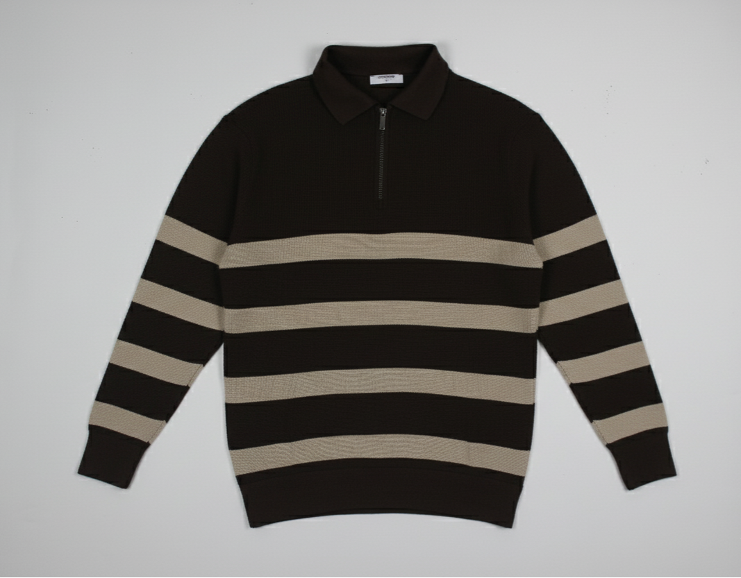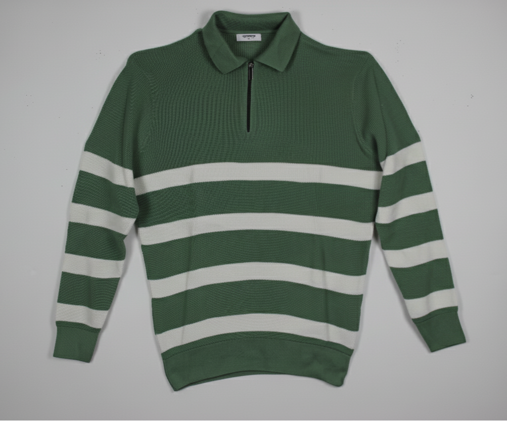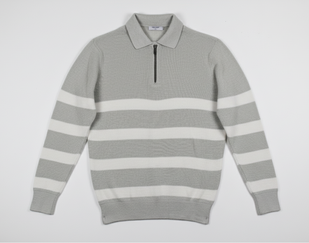 Gömlek Yaka Yarım Fermuarlı Çizgili Triko