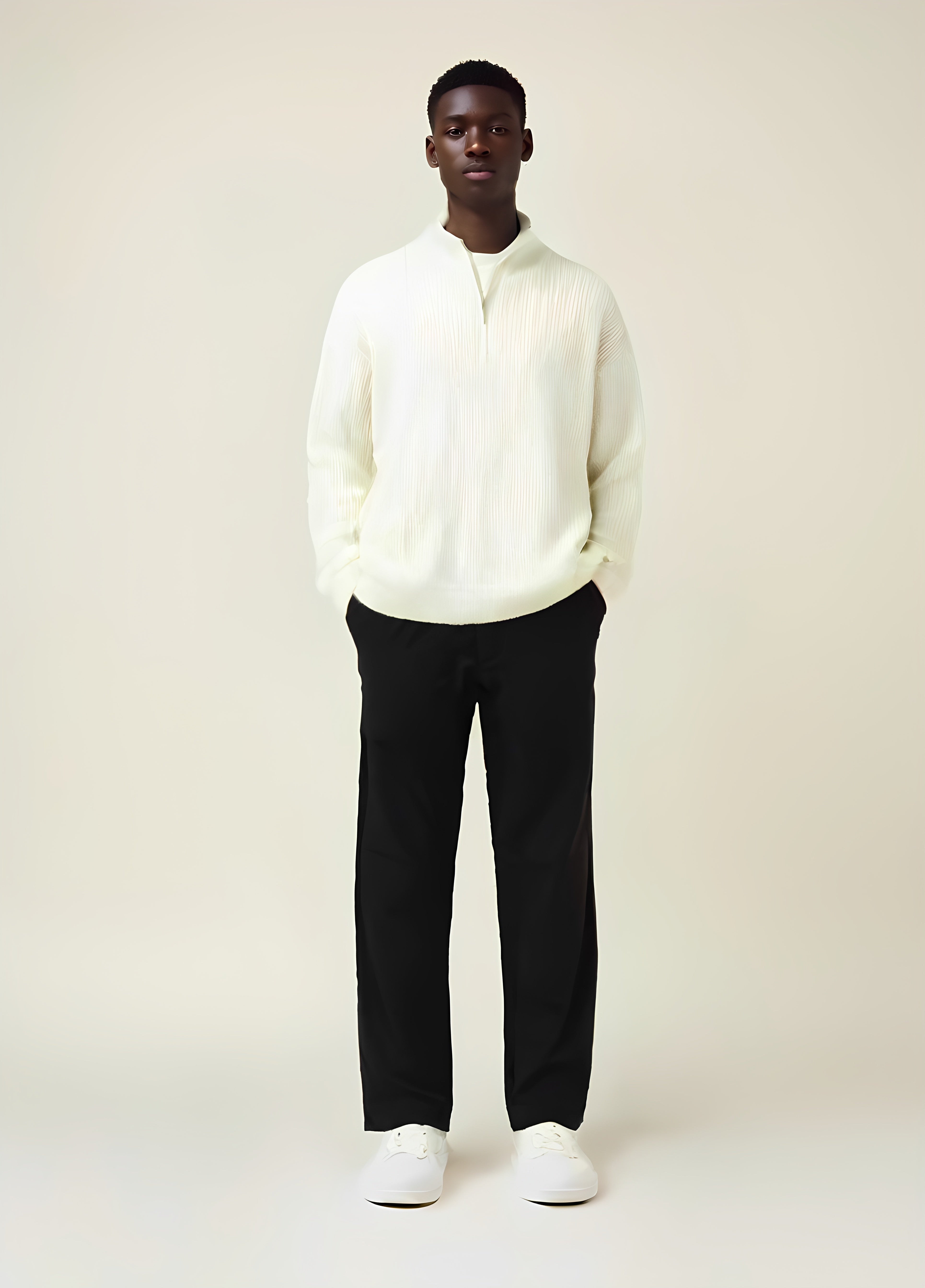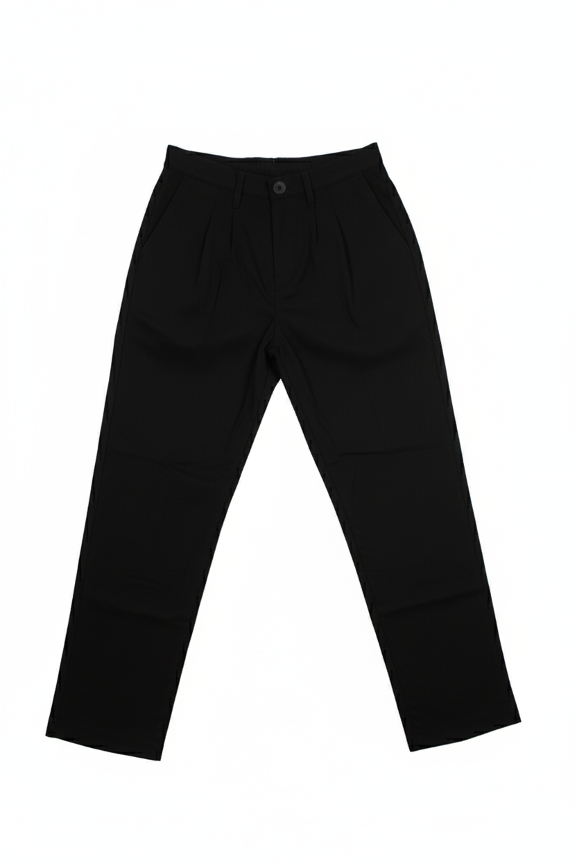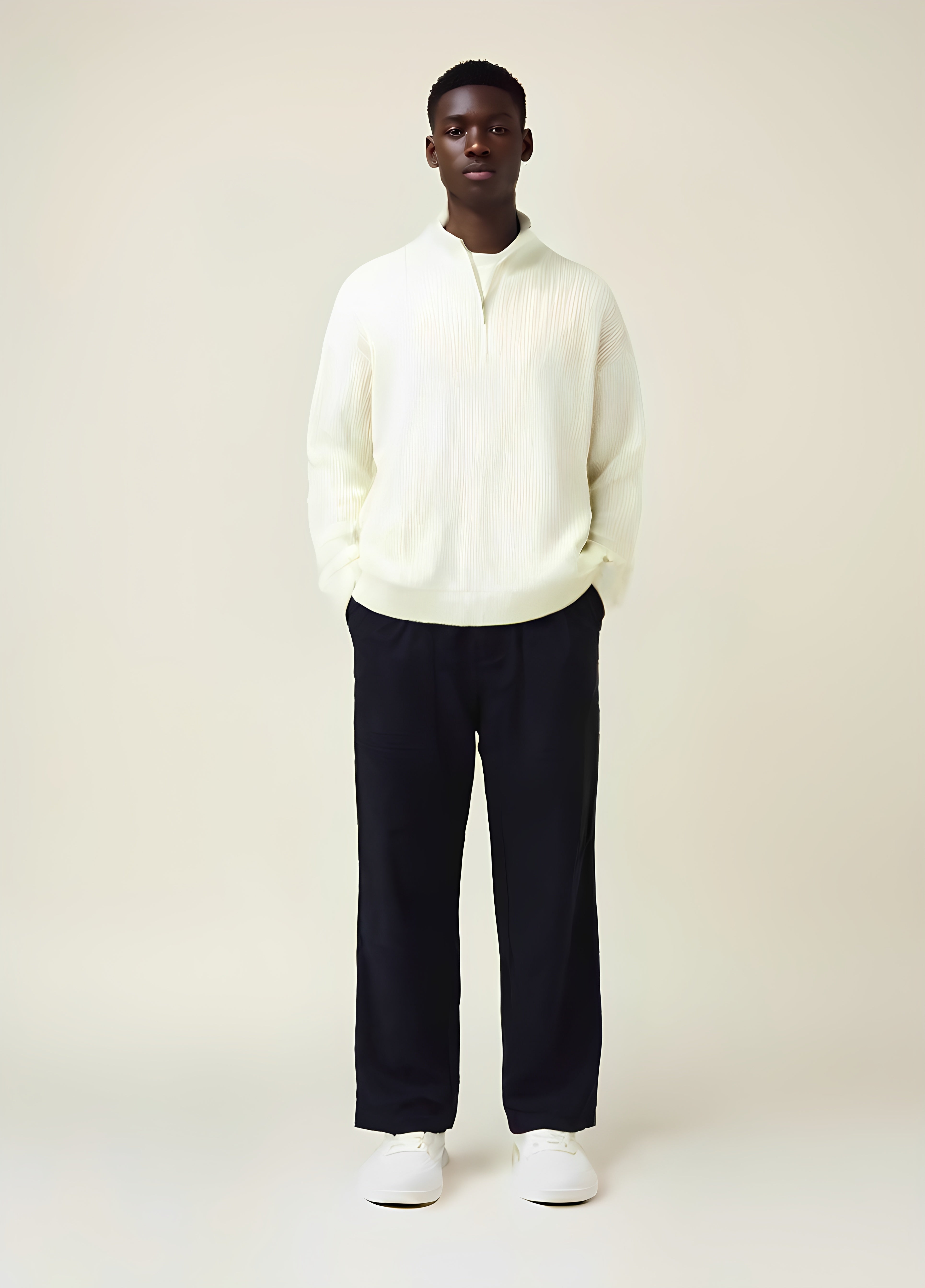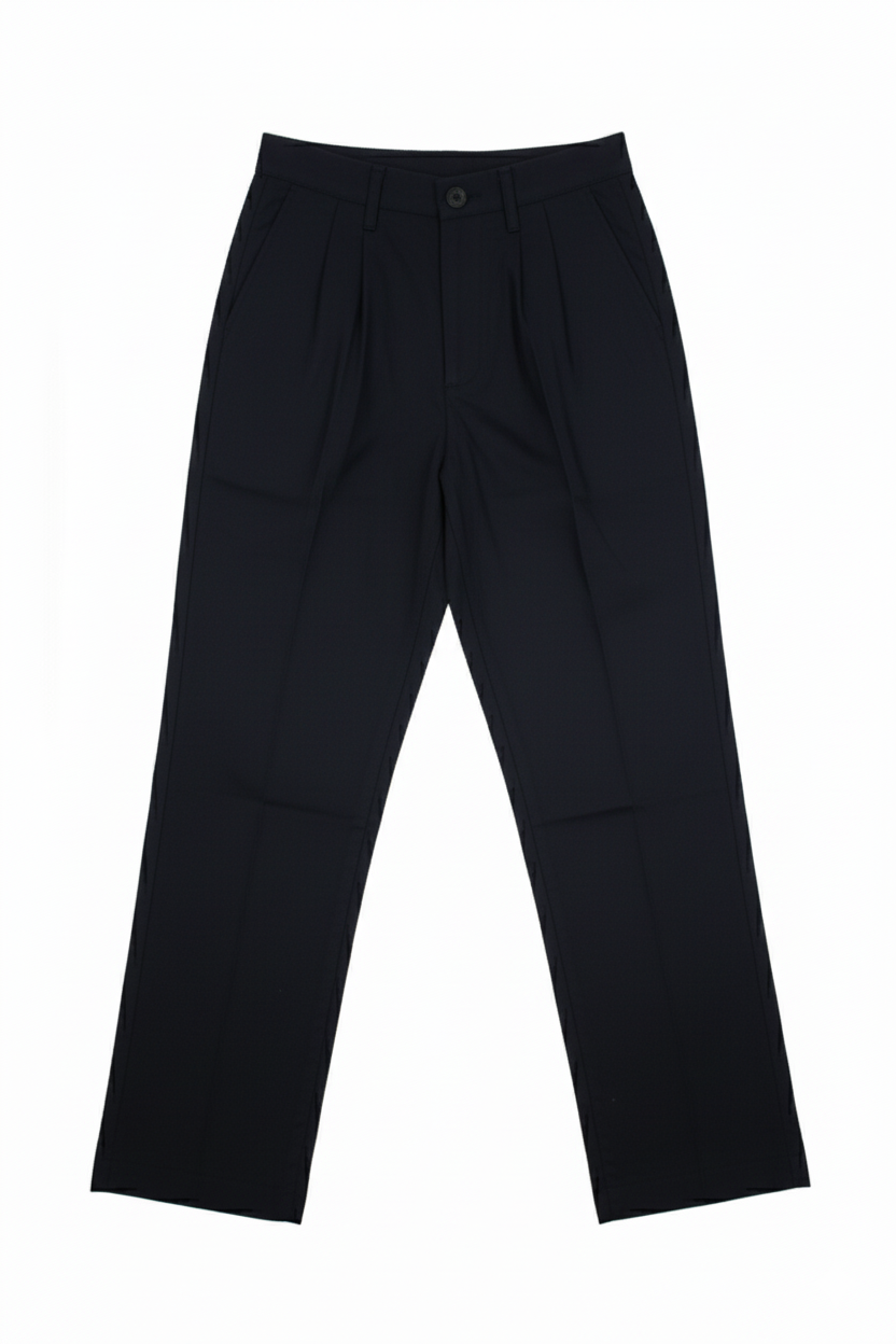 Rahat kesim, beli lastikli ve kemer detaylı, önü fermuarlı ve düğmeli, pilili dökümlü pantolon.
